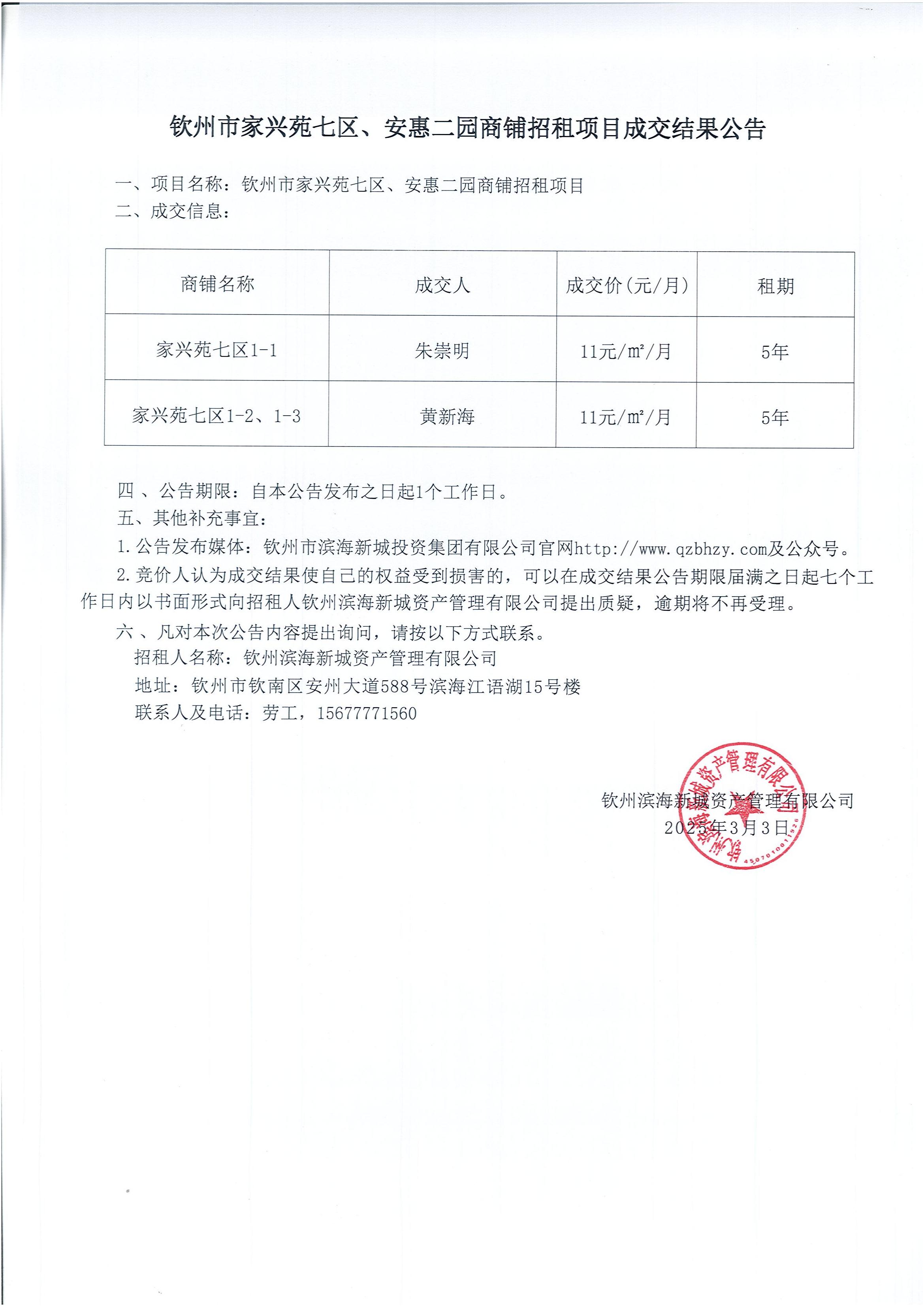 欽州市家興苑七區(qū)、安惠二園商鋪招租項目成交結(jié)果公告