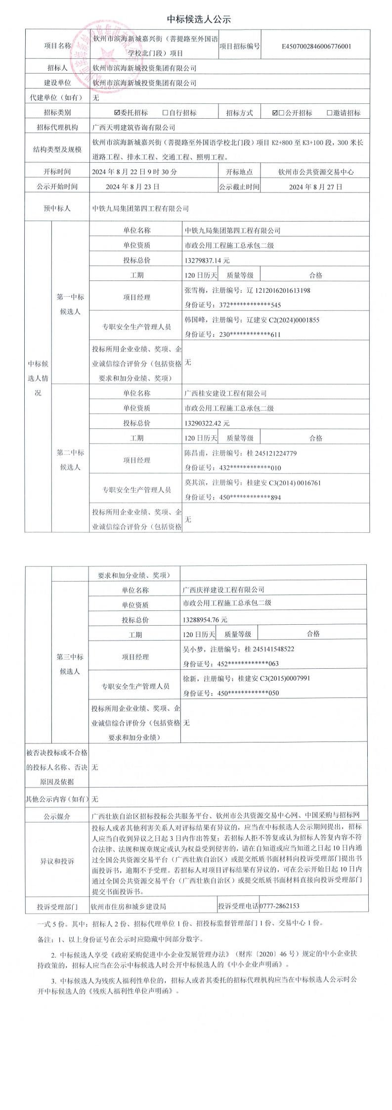 欽州市濱海新城嘉興街(菩提路至外國(guó)語(yǔ)學(xué)校北門段)項(xiàng)目中標(biāo)候選人公示