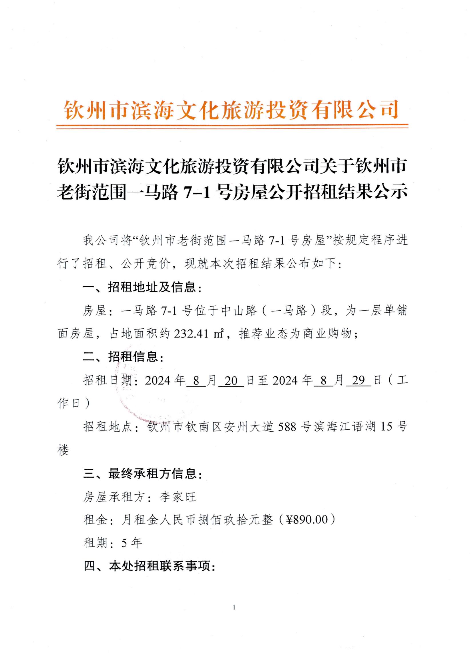 關(guān)于欽州市老街范圍一馬路7-1號(hào)房屋公開招租結(jié)果公示