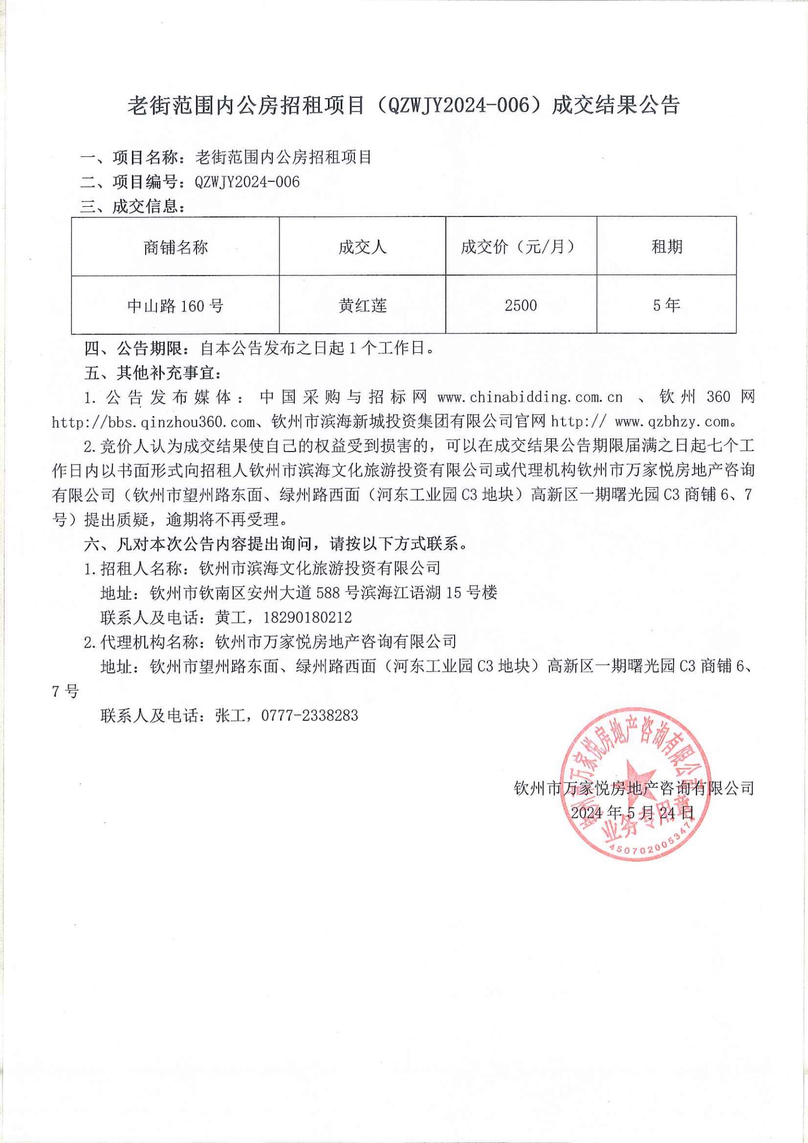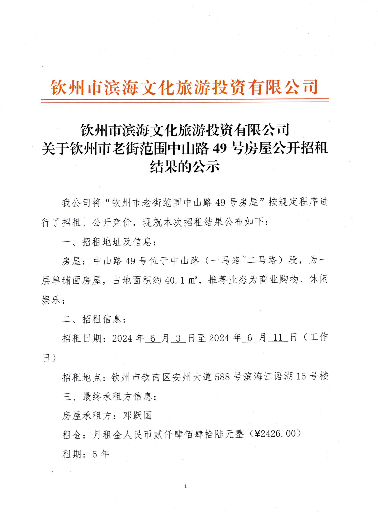 關(guān)于欽州市老街范圍中山路49號房屋公開招租結(jié)果的公示