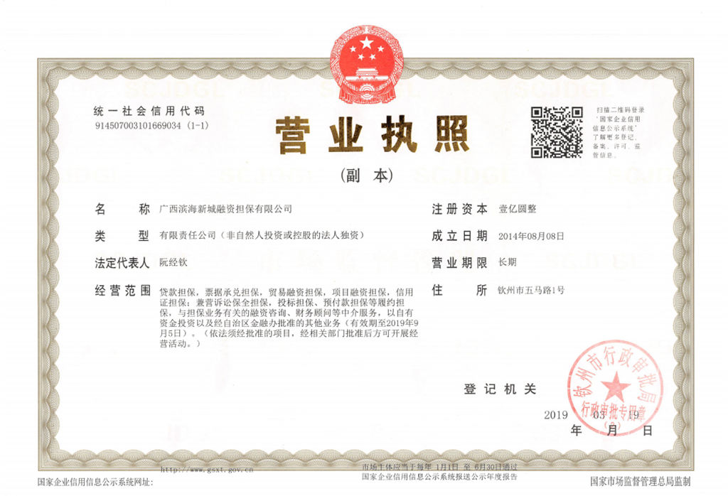 根據(jù)原廣西壯族自治區(qū)金融工作辦公室《廣西壯族自治區(qū)金融工作辦公室關(guān)于印發(fā)2018年全區(qū)融資擔(dān)保公司現(xiàn)場檢查工作方案的通知》(桂金辦融函〔2018〕106號)的整改要求,我擔(dān)保公司立即展開公司名稱的變更工作。經(jīng)欽州市行政審批局同意,于2019年3月19日完成公司名稱的變更并取得新營業(yè)執(zhí)照,變更后的名稱為“廣西濱海新城融資擔(dān)保有限公司”。