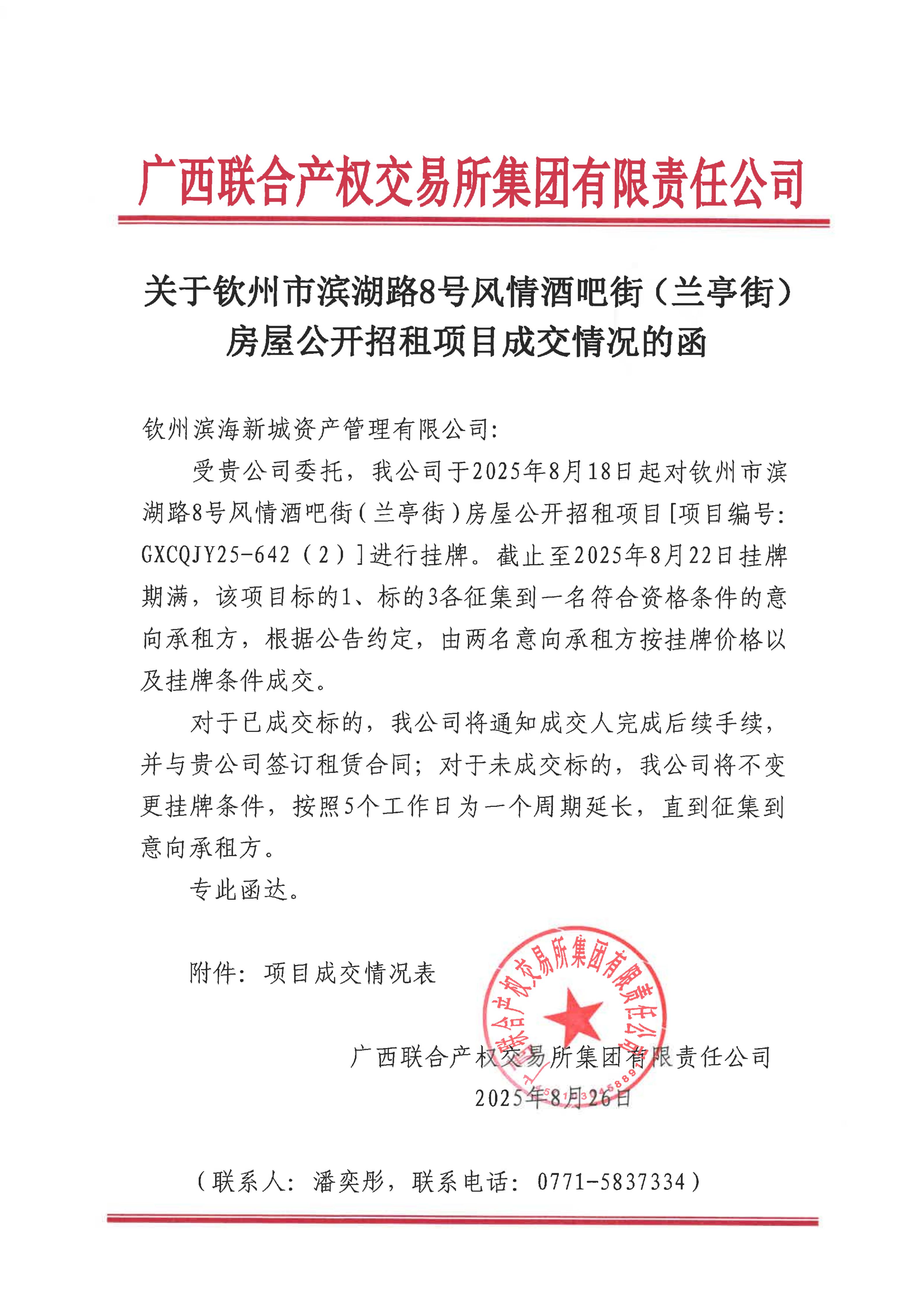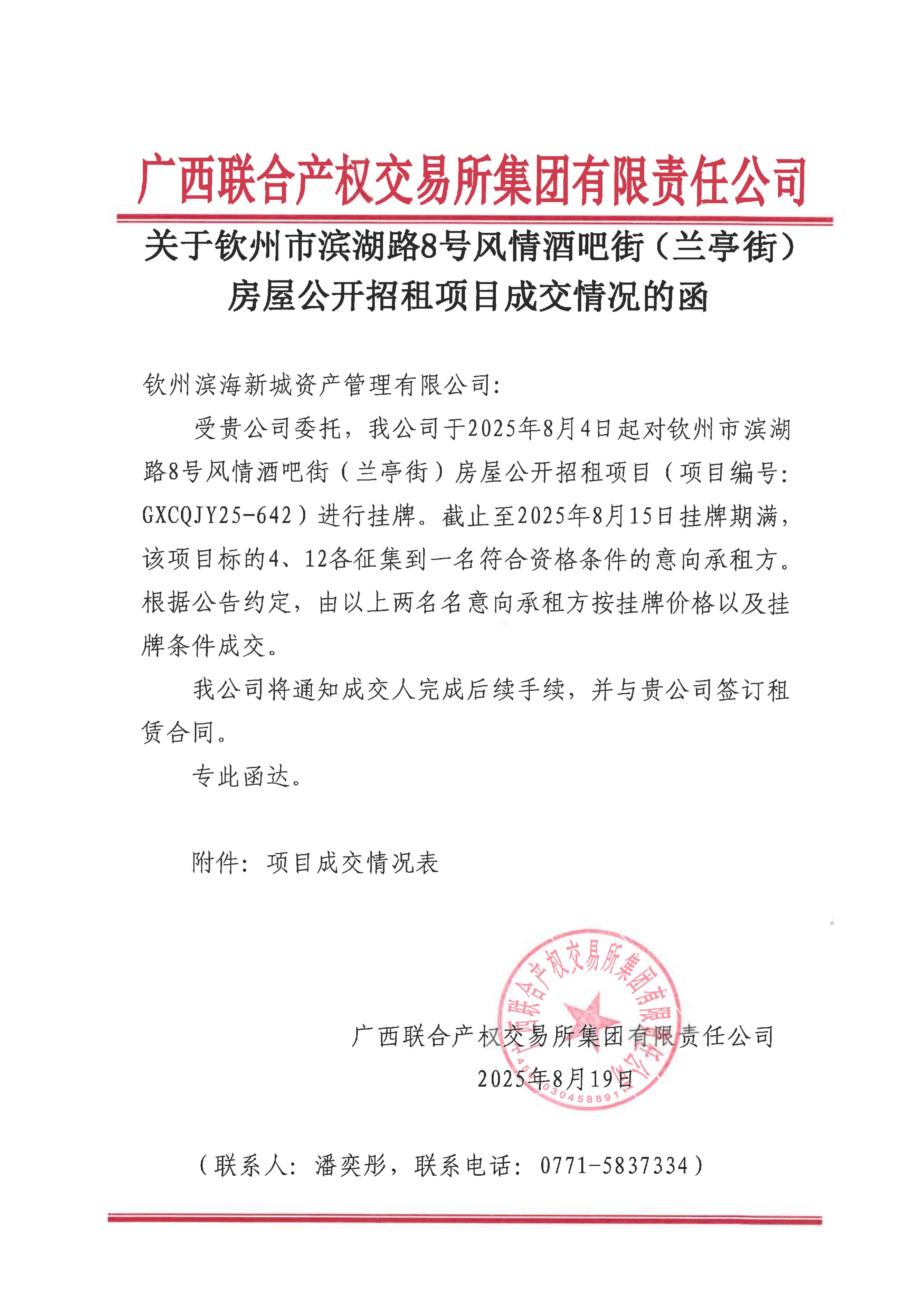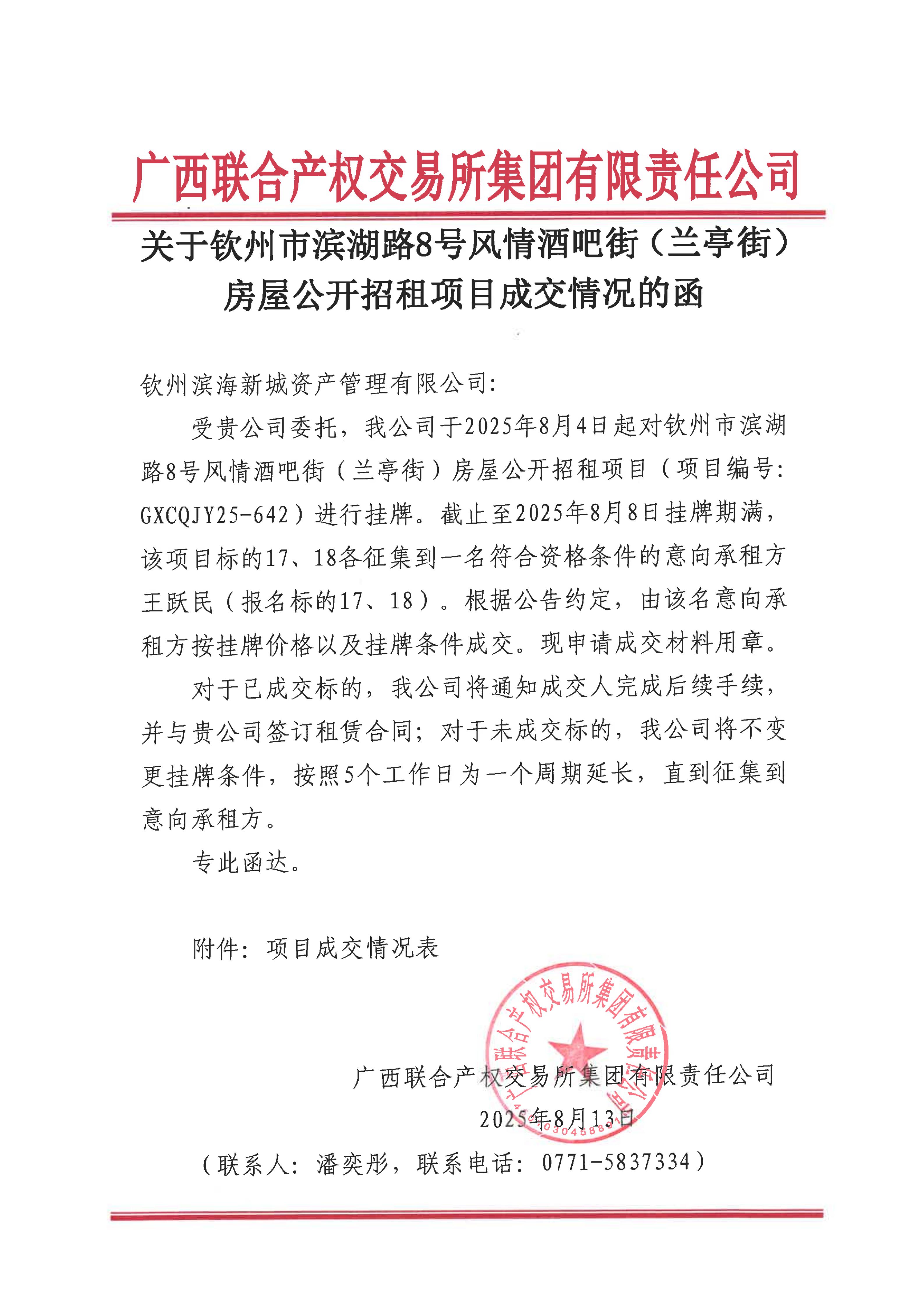 關(guān)于欽州市濱湖路8號(hào)風(fēng)情酒吧街(蘭亭街)房屋公開(kāi)招租項(xiàng)目成交情況的函(...