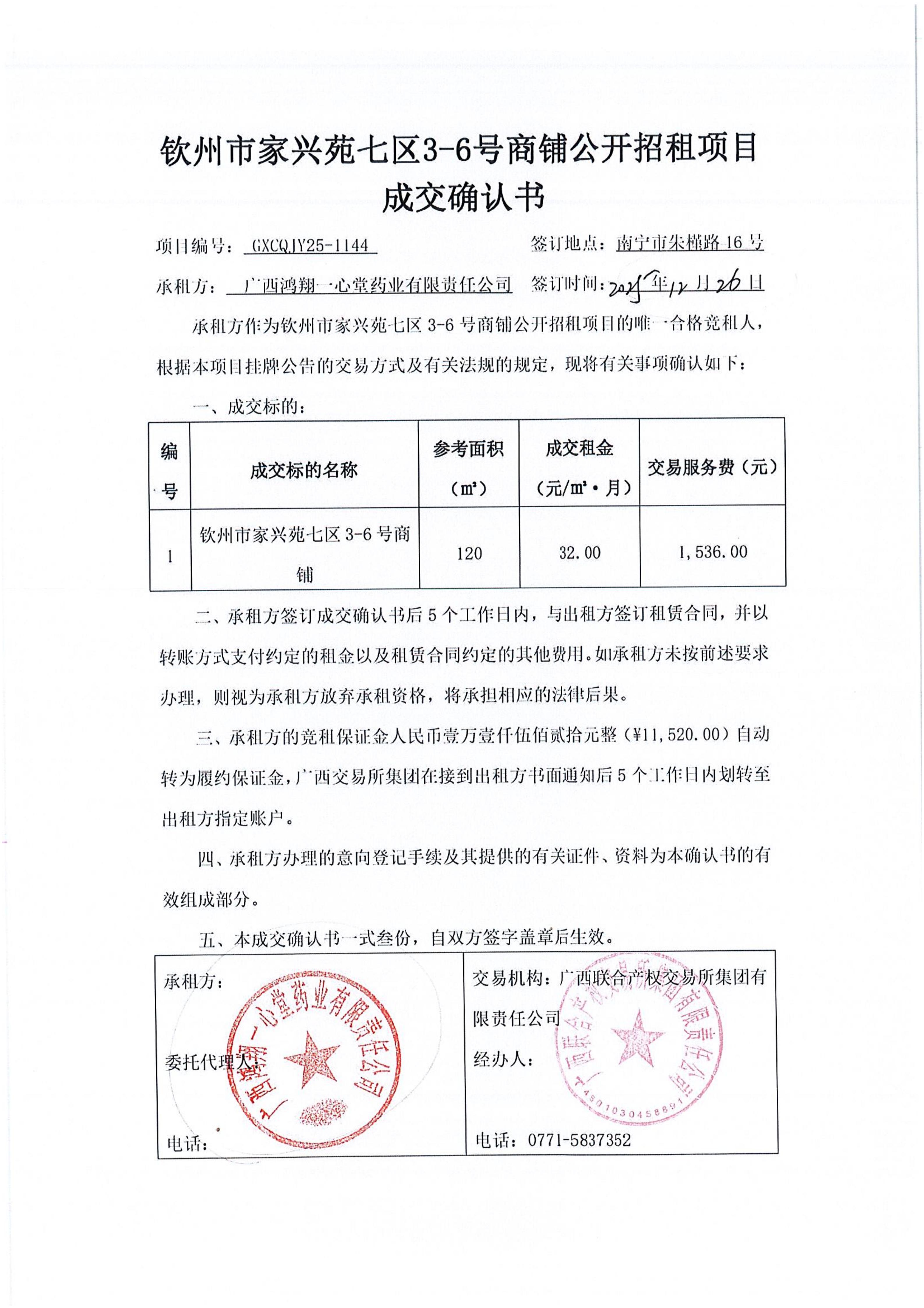 欽州市家興苑七區(qū)3-6號商鋪公開招租項(xiàng)目 成交確認(rèn)書
