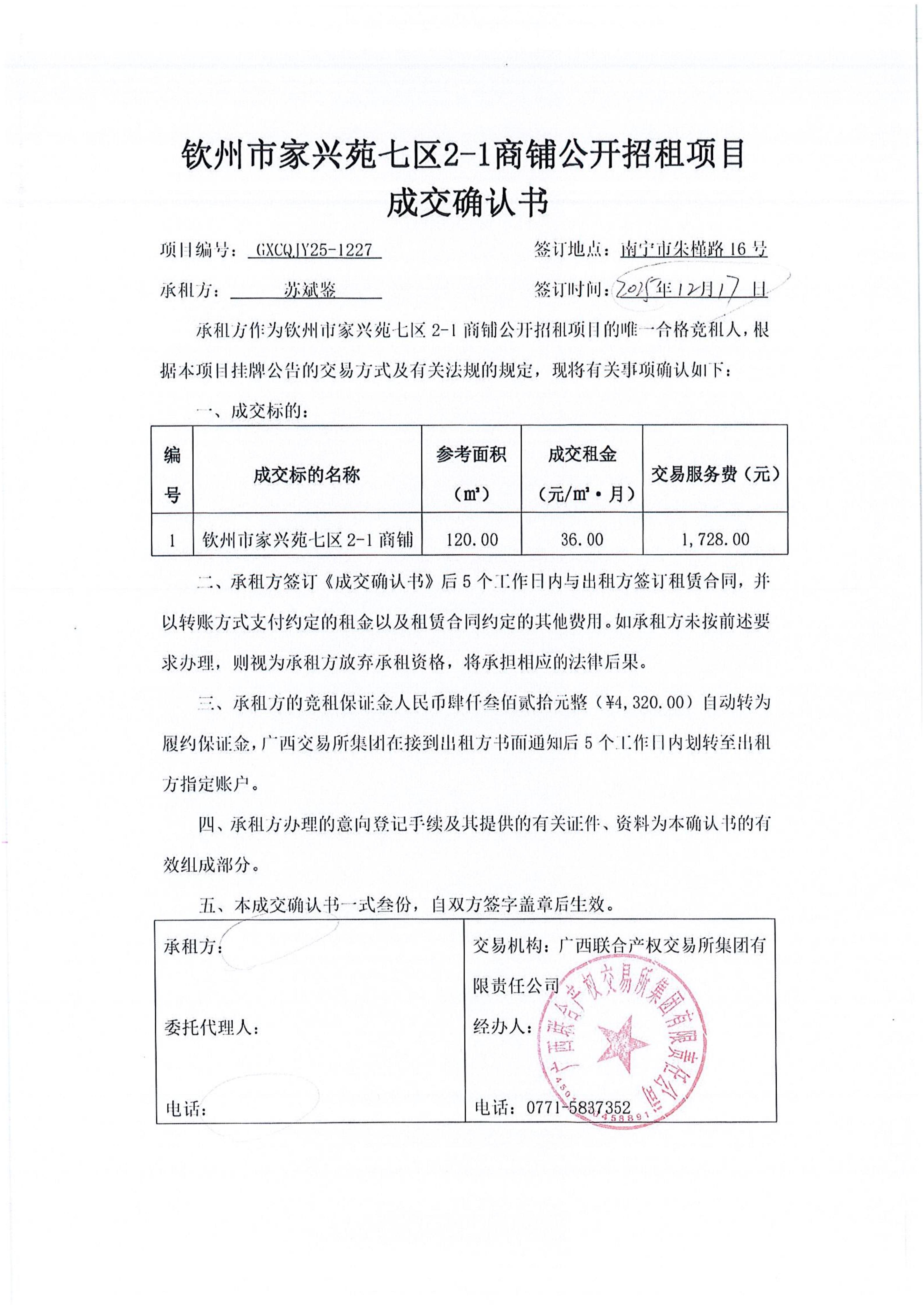 欽州市家興苑七區(qū)2-1商鋪公開招租項(xiàng)目 成交確認(rèn)書