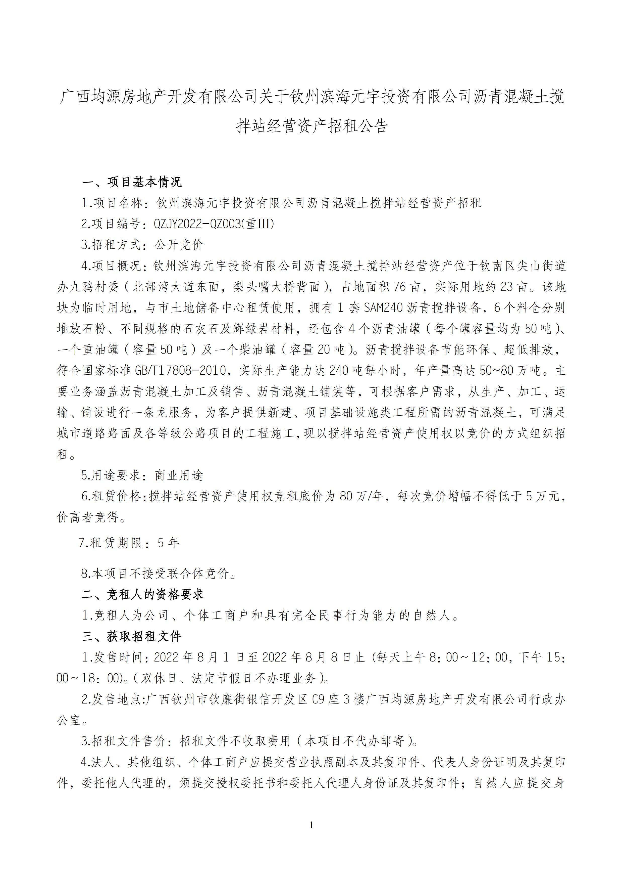 1.項目名稱:欽州濱海元宇投資有限公司瀝青混凝土攪拌站經營資產招租