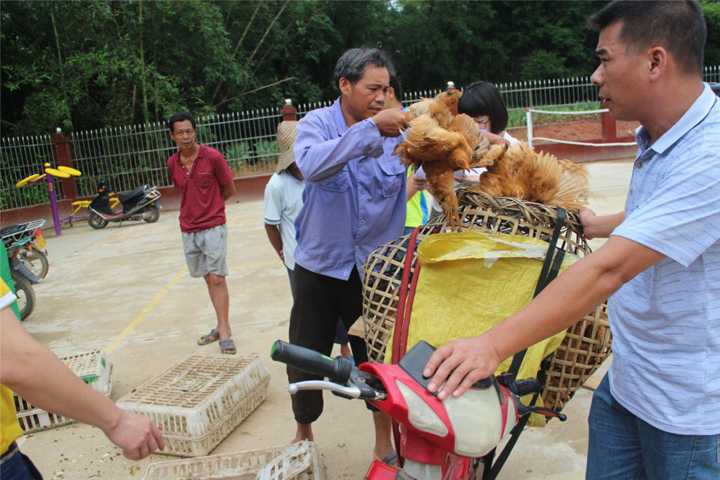 當(dāng)天上午,運(yùn)送雞苗的貨車(chē)從欽州市出發(fā),經(jīng)過(guò)1個(gè)小時(shí)的行程來(lái)到了靈山縣伯勞鎮(zhèn)新禾村公共服務(wù)中心,此時(shí),貧困戶們已經(jīng)滿心歡喜地到來(lái),攜帶裝雞苗的籠子耐心等候著?,F(xiàn)場(chǎng),集團(tuán)公司副總經(jīng)理?xiàng)钚聴澰诠ぷ魅藛T的協(xié)助下,依次給貧困戶們發(fā)放了雞苗,楊新棟笑著對(duì)貧困戶說(shuō)到:“大家領(lǐng)取到的雞苗平均每只重600克左右,雞苗在運(yùn)出養(yǎng)殖場(chǎng)之前都已閹割過(guò)了,具有生長(zhǎng)發(fā)育快、抗病能力強(qiáng)、成活率高、市場(chǎng)效益好等特點(diǎn),大家回去后要管護(hù)好雞苗,讓扶貧雞真正為大家?guī)?lái)脫貧希望。”,看著一只只活潑亂跳、帶著脫貧希望的雞苗裝進(jìn)了自家的籠子里,貧困戶們笑得合不攏嘴,心里樂(lè)開(kāi)了花。