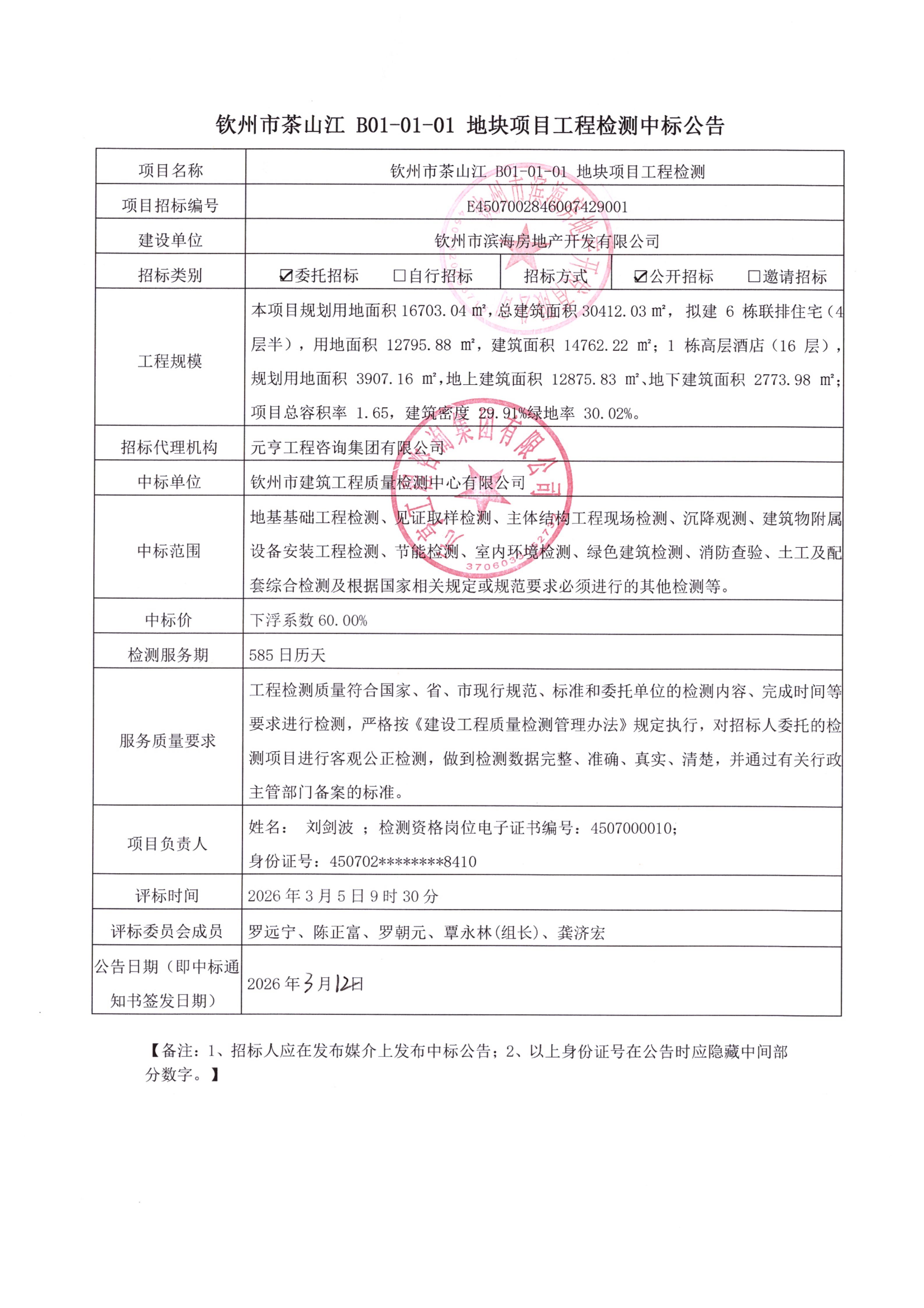 欽州市茶山江 B01-01-01地塊項(xiàng)目工程檢測(cè)中標(biāo)公告