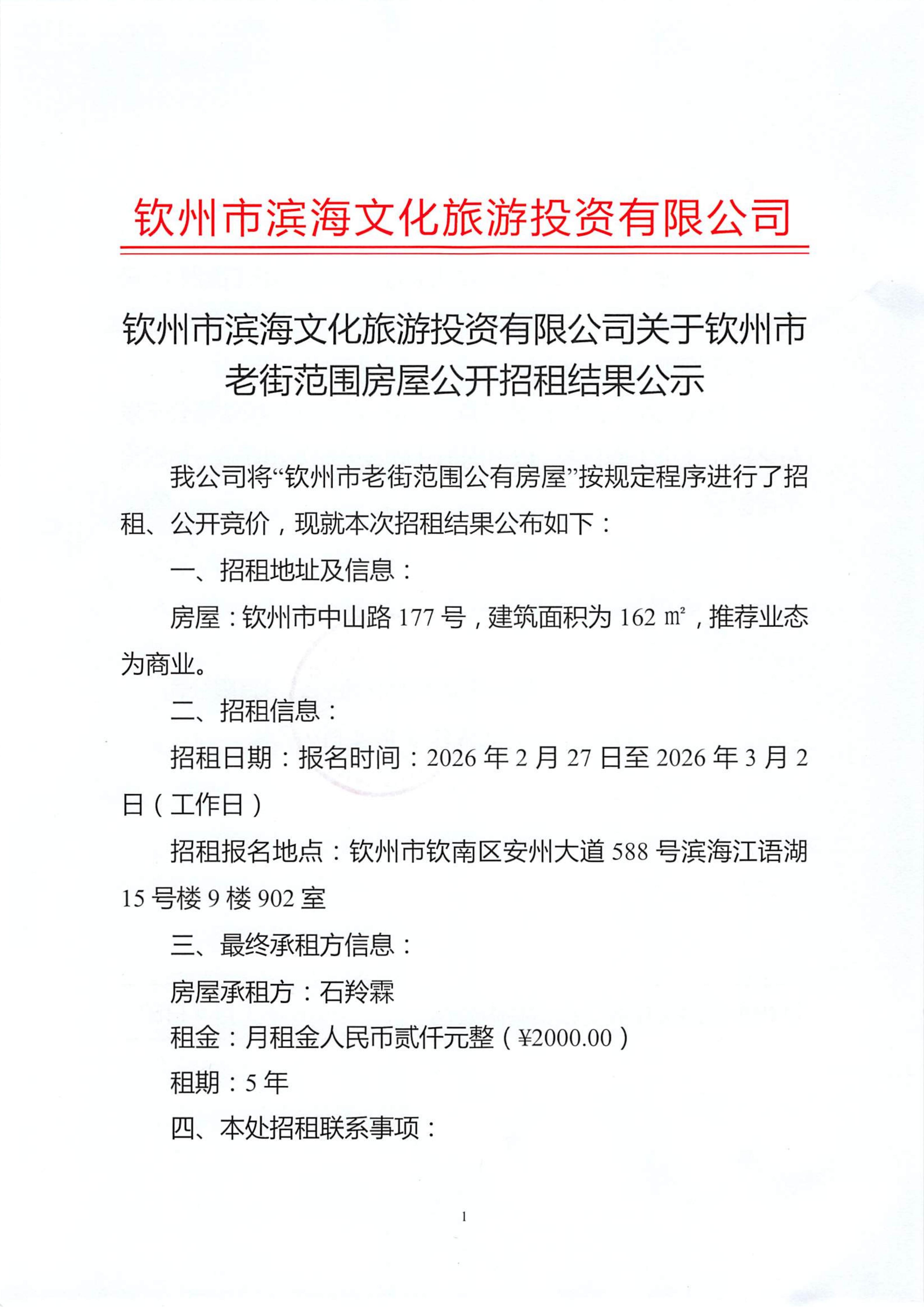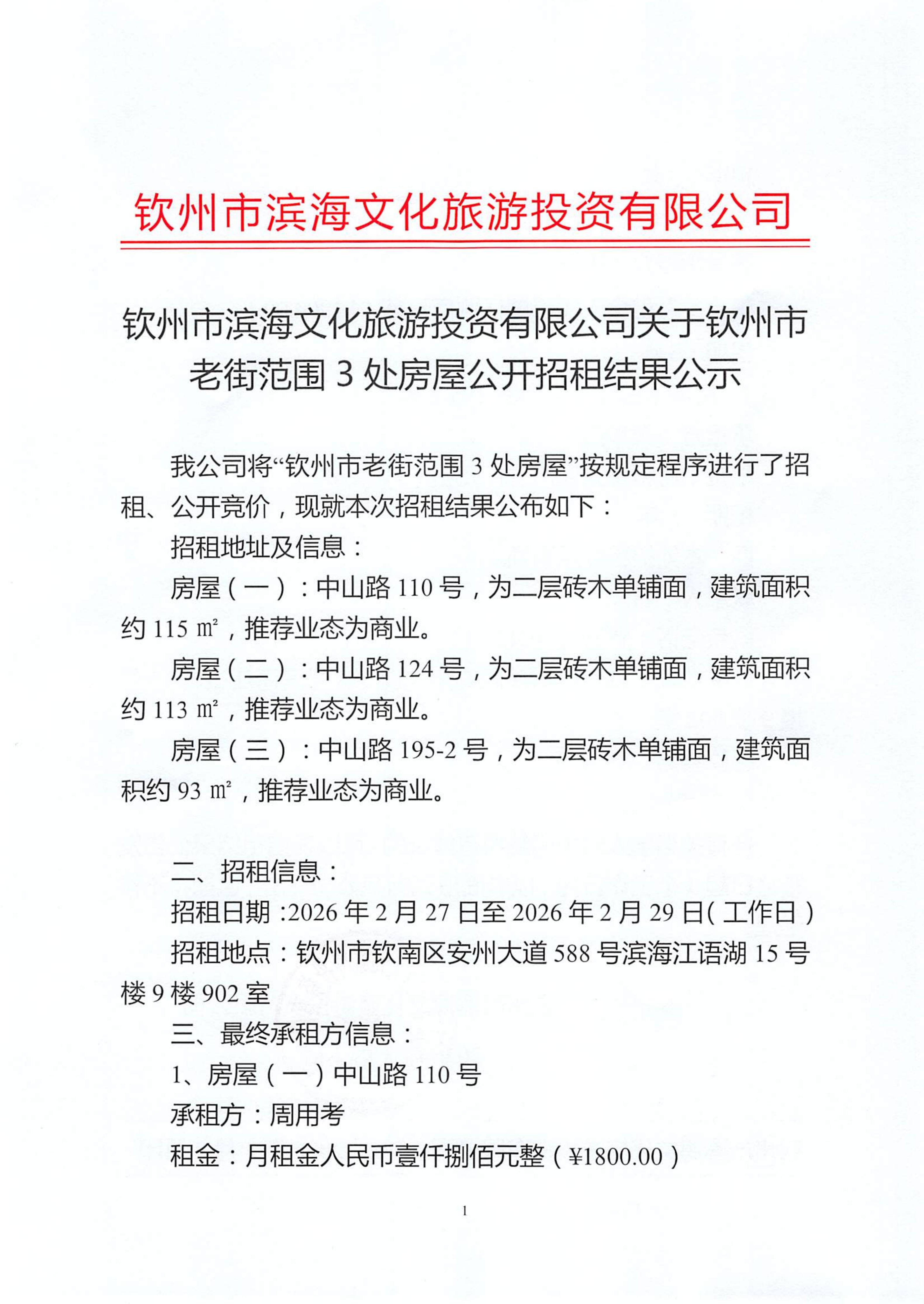 欽州市濱海文化旅游投資有限公司關(guān)于欽州市老街范圍房屋公開(kāi)招租結(jié)果公示