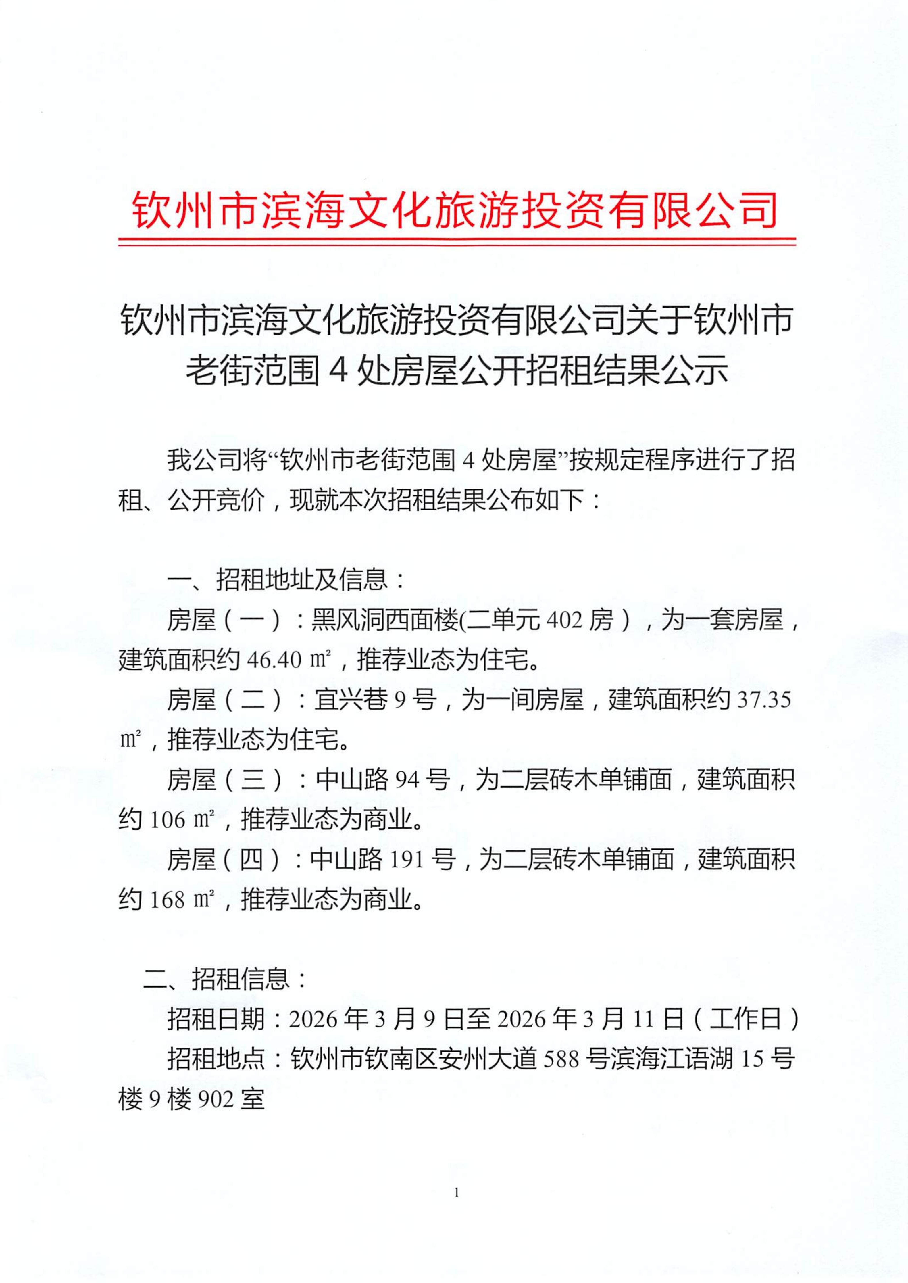 欽州市濱海文化旅游投資有限公司關(guān)于欽州市老街范圍4處房屋公開(kāi)招租結(jié)果公示
