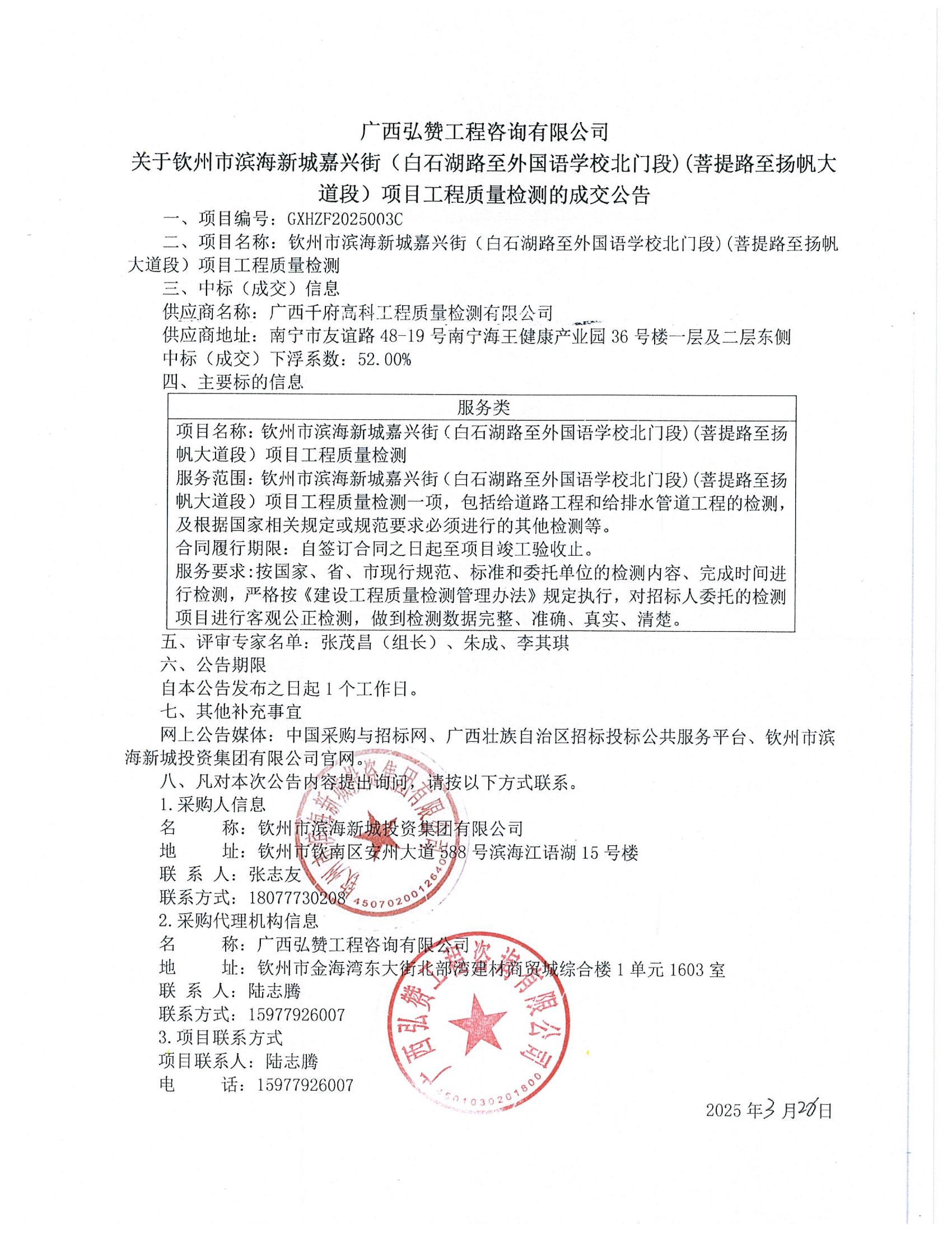 欽州市濱海新城嘉興街(白石湖路至外國語學(xué)校北門段)(菩提路至揚帆大道段)項目工程質(zhì)量檢測的成交公告