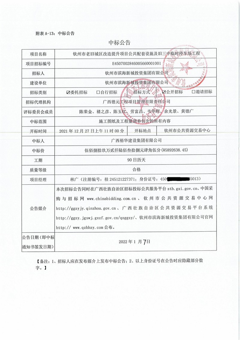 中標(biāo)公告-欽州市老舊城區(qū)改造提升項(xiàng)目公共配套設(shè)施及舊三中臨時(shí)停車場(chǎng)工程