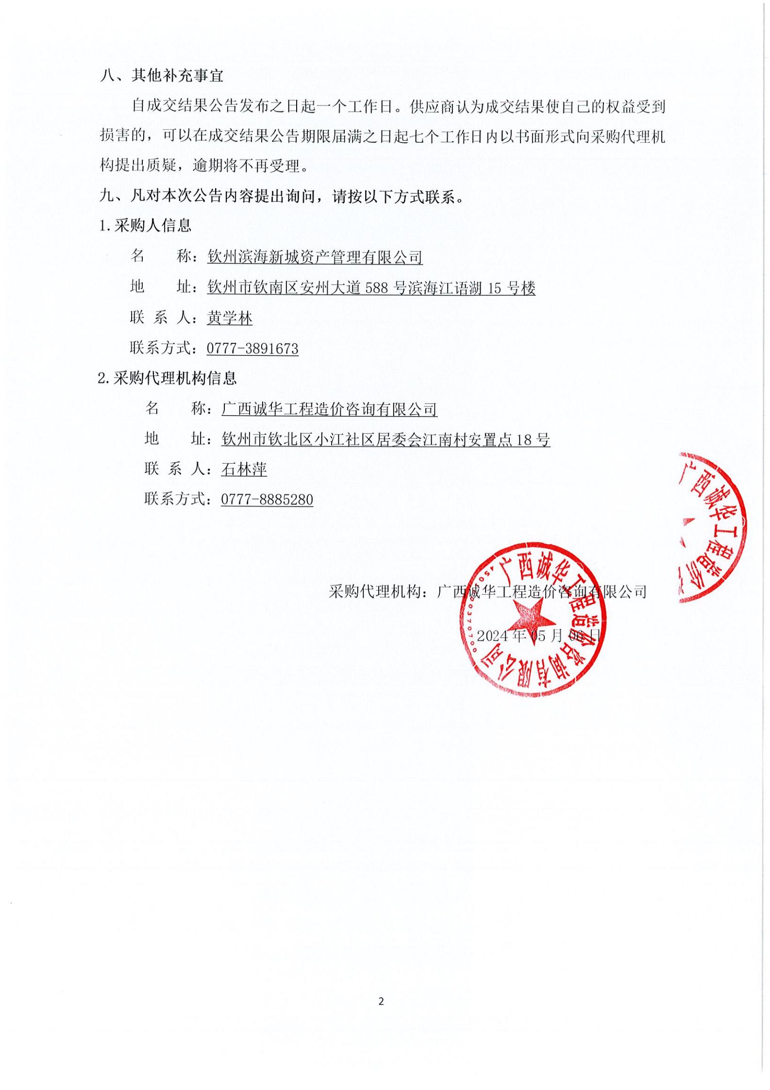 關(guān)于欽州市濱海新城投資集團(tuán)有限公司綜合展示廳成交結(jié)果公告