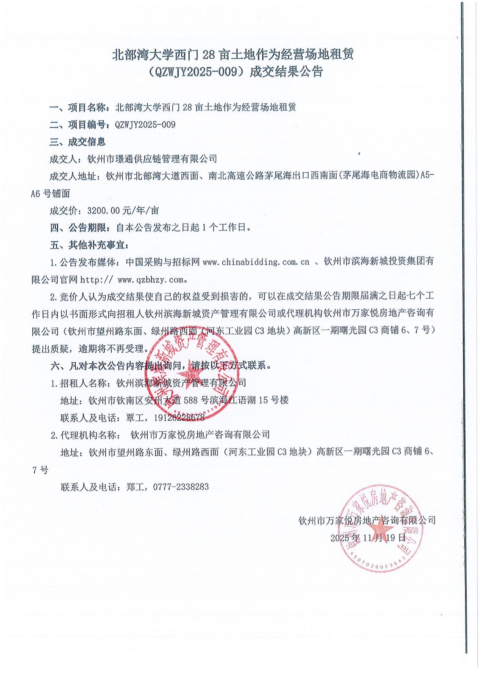 北部灣大學(xué)西門(mén)28畝土地作為經(jīng)營(yíng)場(chǎng)地租賃(QZWJY2025-009)成交結(jié)果公告
