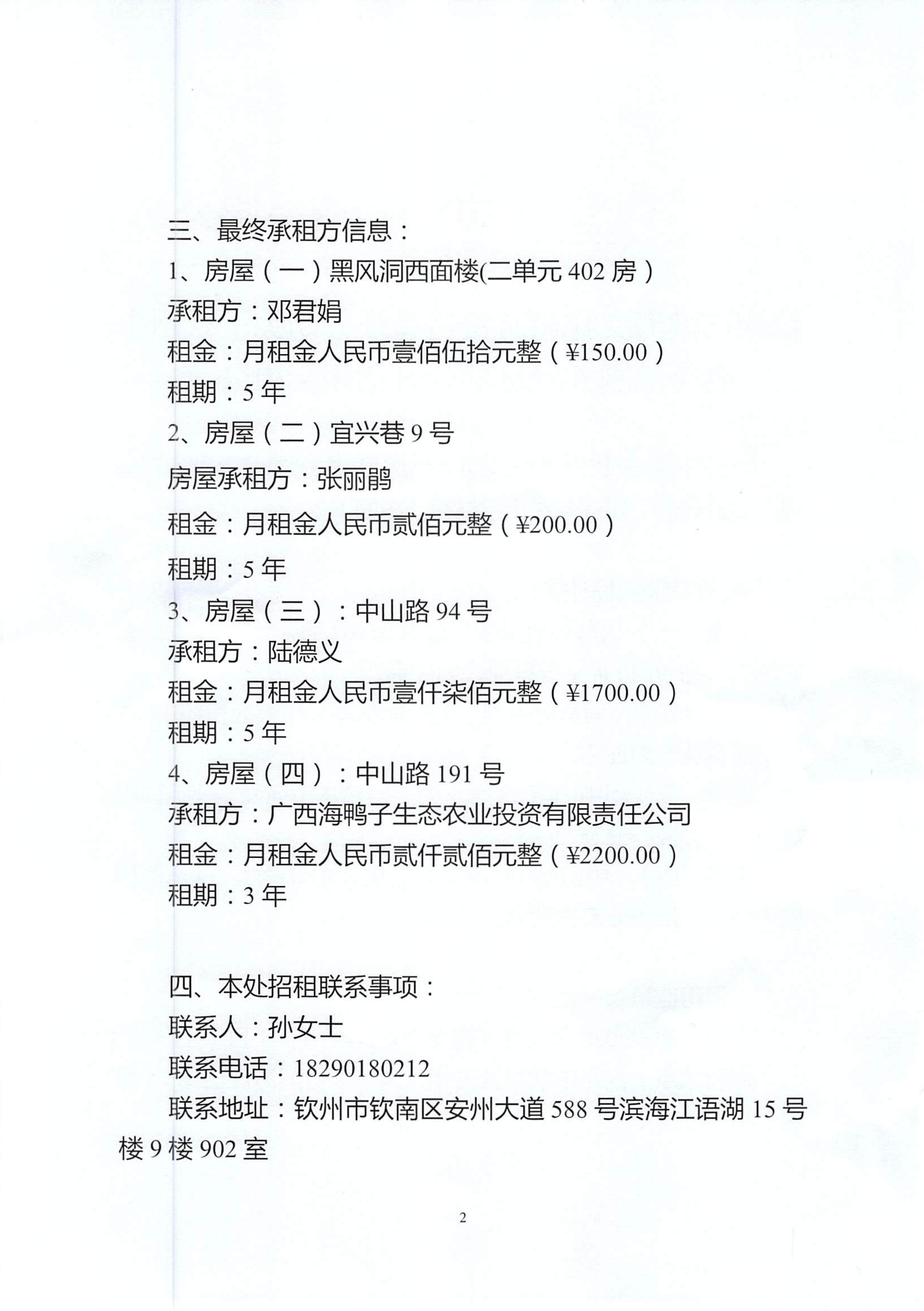欽州市濱海文化旅游投資有限公司關(guān)于欽州市老街范圍4處房屋公開招租結(jié)果公示