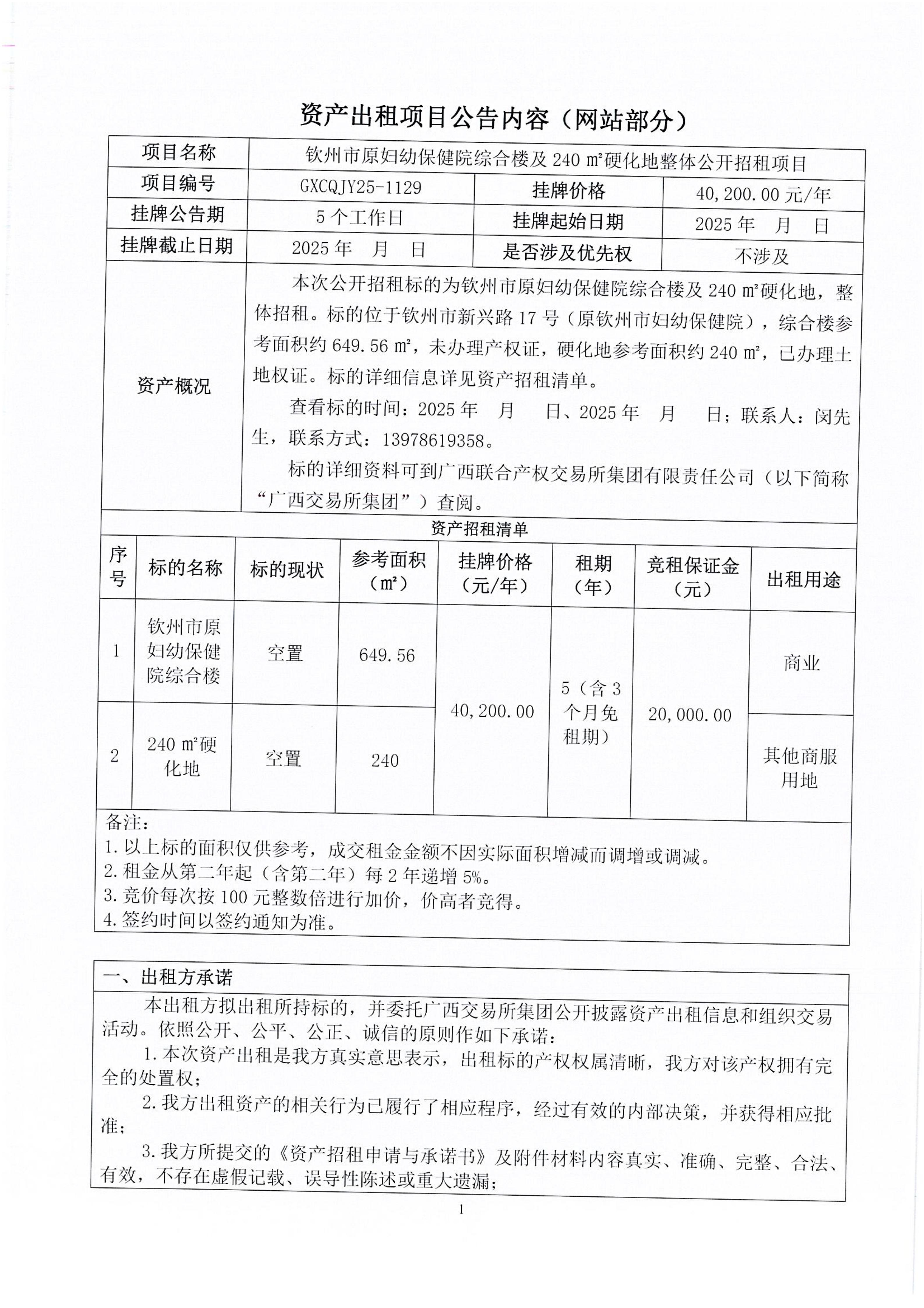 欽州市原婦幼保健院綜合樓及240m硬化地整體公開招租項目