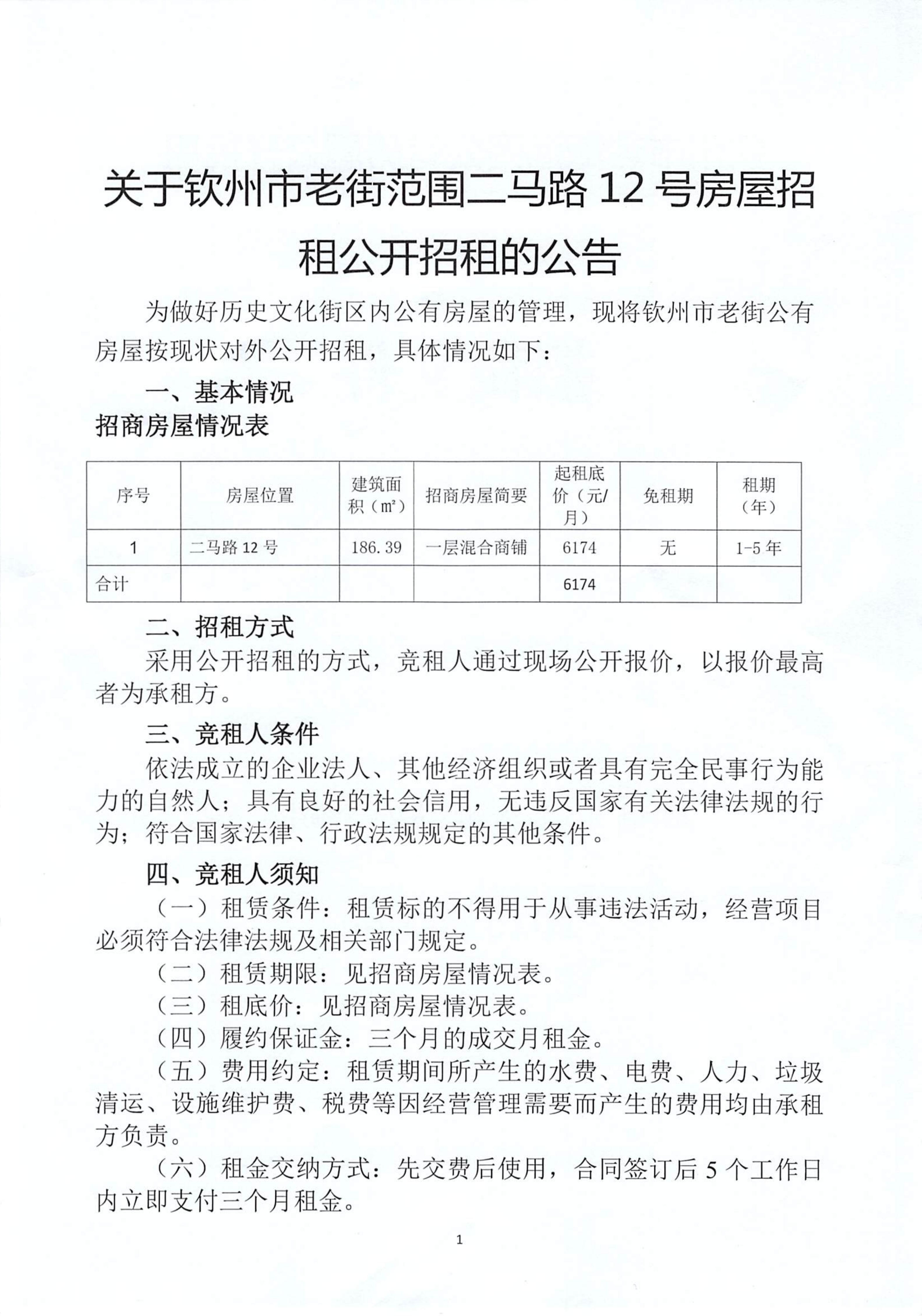 關(guān)于欽州市老街范圍二馬路12號(hào)房屋招 租公開(kāi)招租的公告